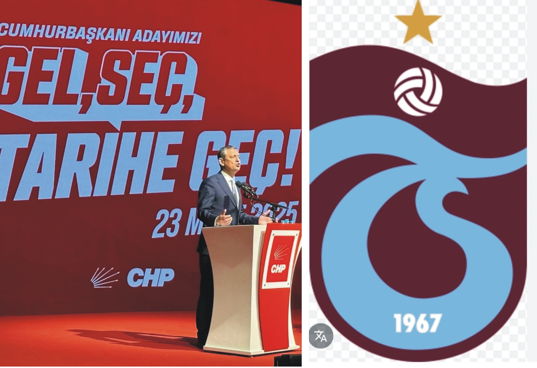 CHP’nin cumhurbaşkanlığı önseçim toplantısında, ”Gel, Seç, Tarihe Geç” sloganının bordo-mavi zemini de İmamoğlu’nun Trabzonluluğuyla ne denli gurur duyduğunu gözler önüne seriyor.