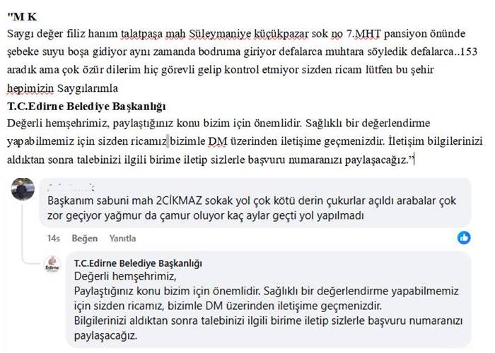 Ama vatandaş şikayetlerine, Edirne Belediyesi’nin resmi sosyal medya hesabından verilen cevaplara bir anlam veremediğim için köşeme taşımak istedim bugün.